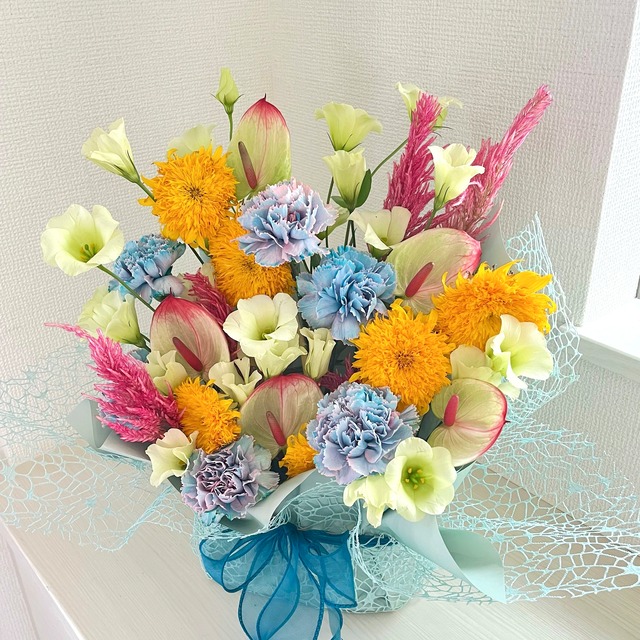 トロピカルな雰囲気で作るおまかせアレンジメントです。 仕入れ状況によりアレンジメントに入るお花は写真と異なります。写真は雰囲気・ボリューム感の参考例としてご覧ください。 お届け希望日の5日前までにご予約をお願いいたします。