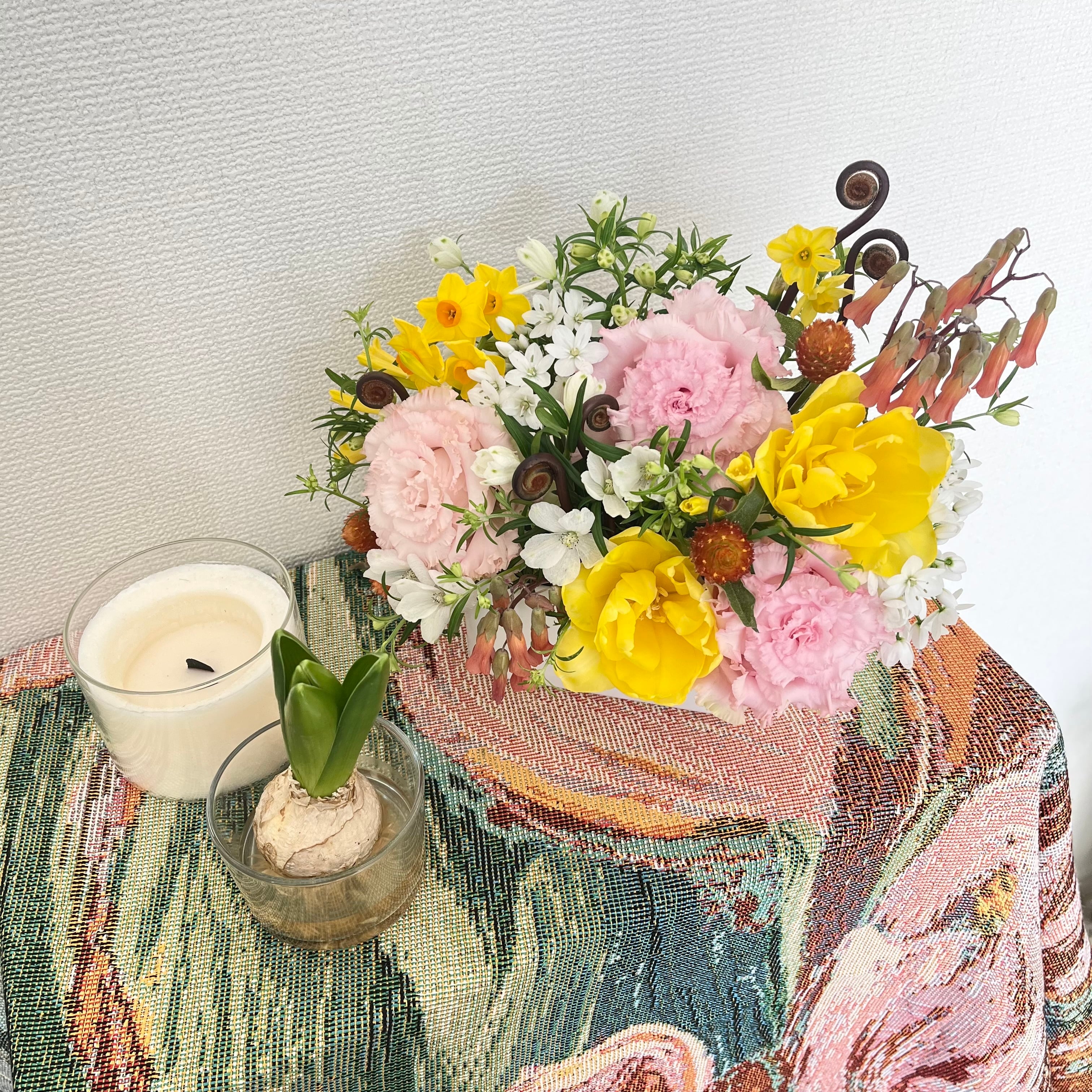 仕入れ状況によりアレンジメントに入るお花は写真と異なります。写真は雰囲気・ボリューム感の参考例としてご覧ください。