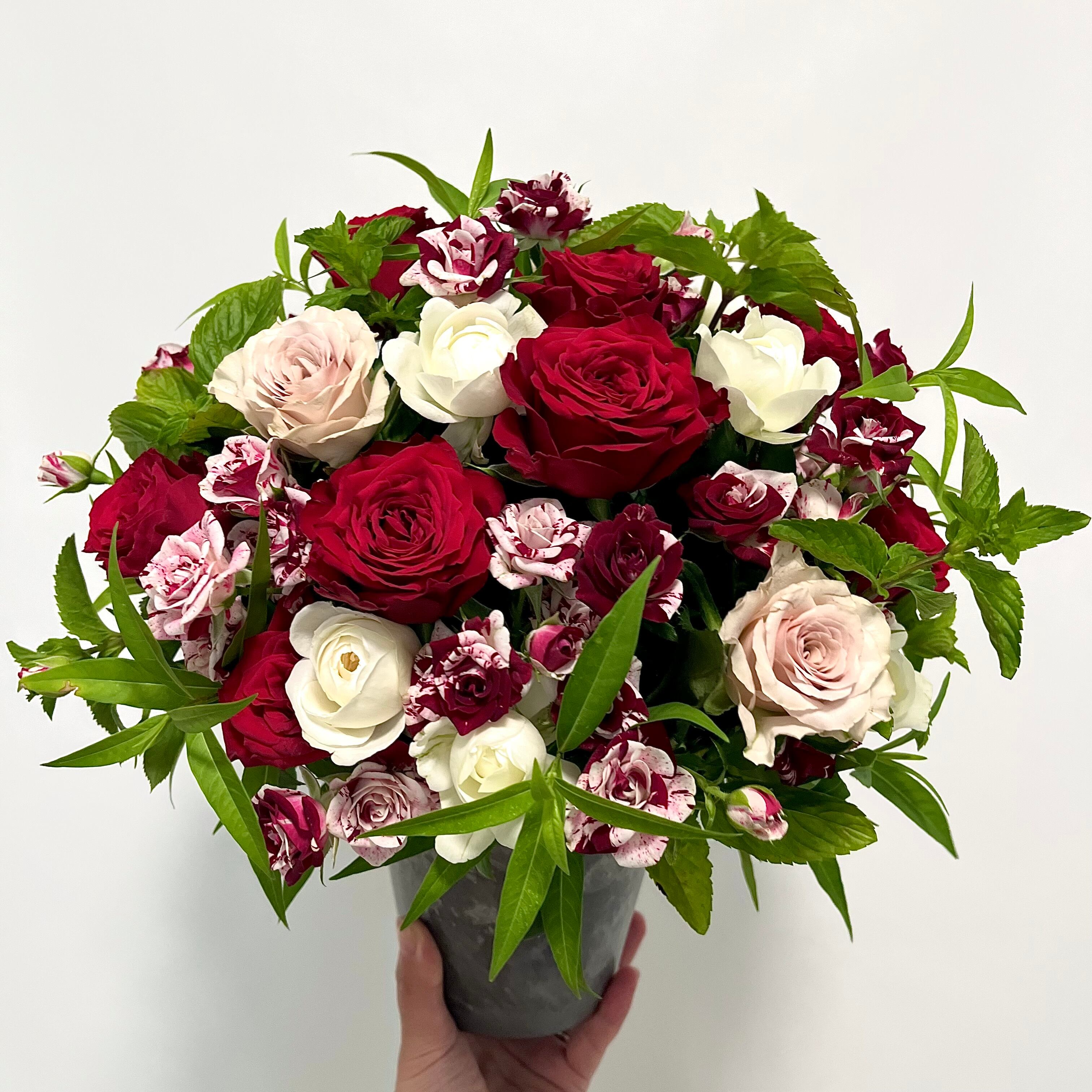 季節・仕入れ状況によりアレンジメントに入るお花は写真と異なります。写真は雰囲気・ボリューム感の参考例としてご覧ください。
