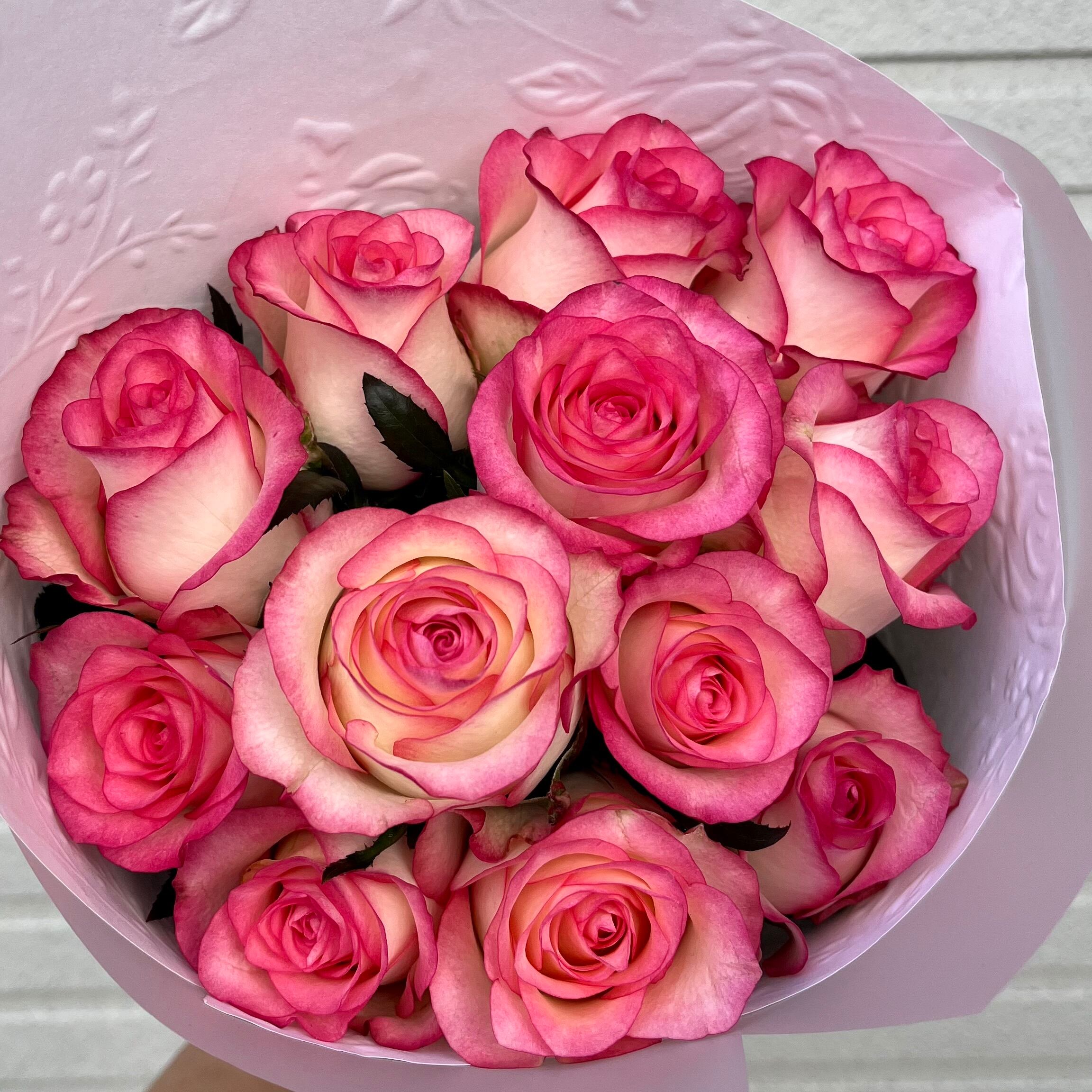 仕入れ状況によりブーケに入るバラの品種は異なります。写真はボリューム感の参考例としてご覧ください。