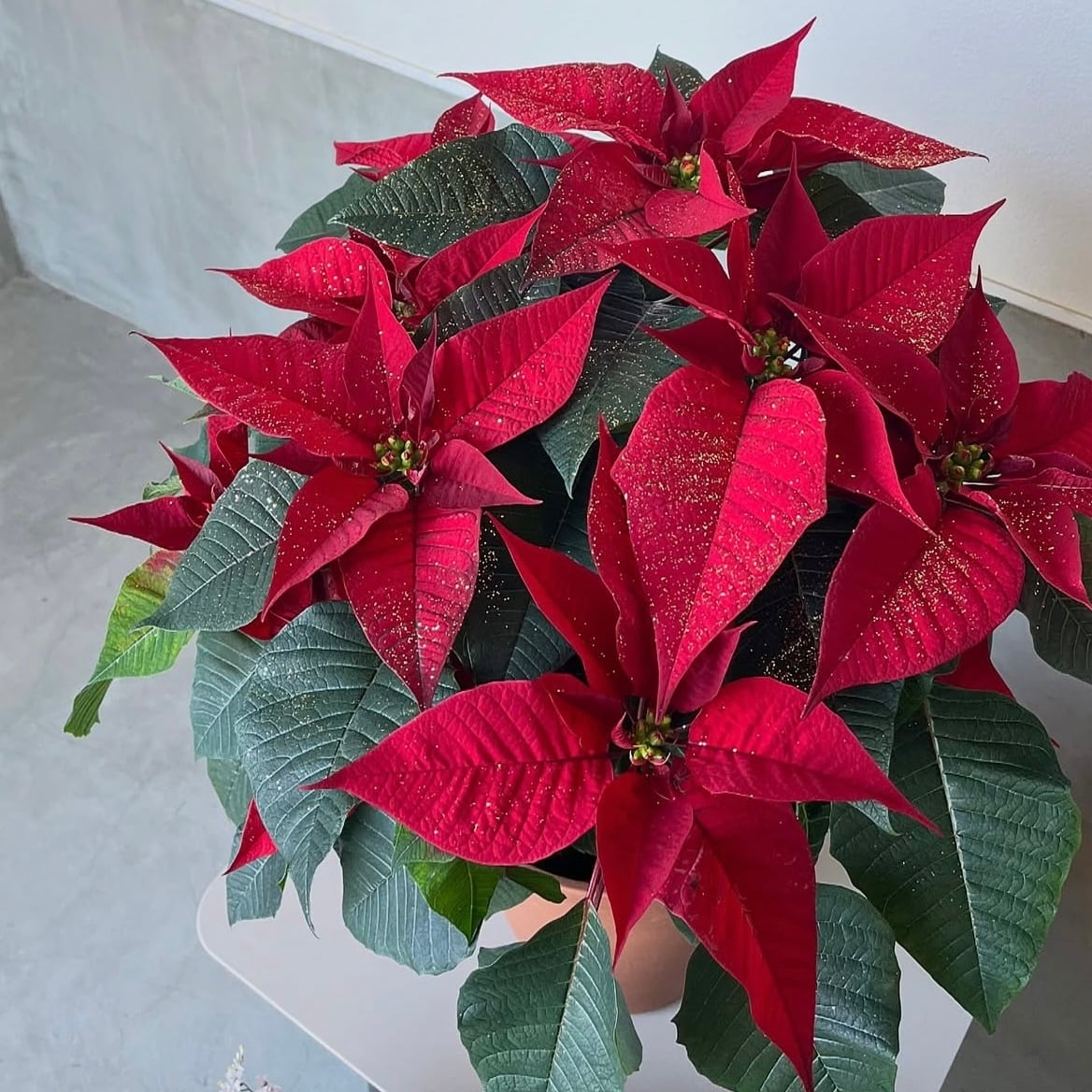 6号鉢から溢れるボリュームたっぷりのポインセチア。