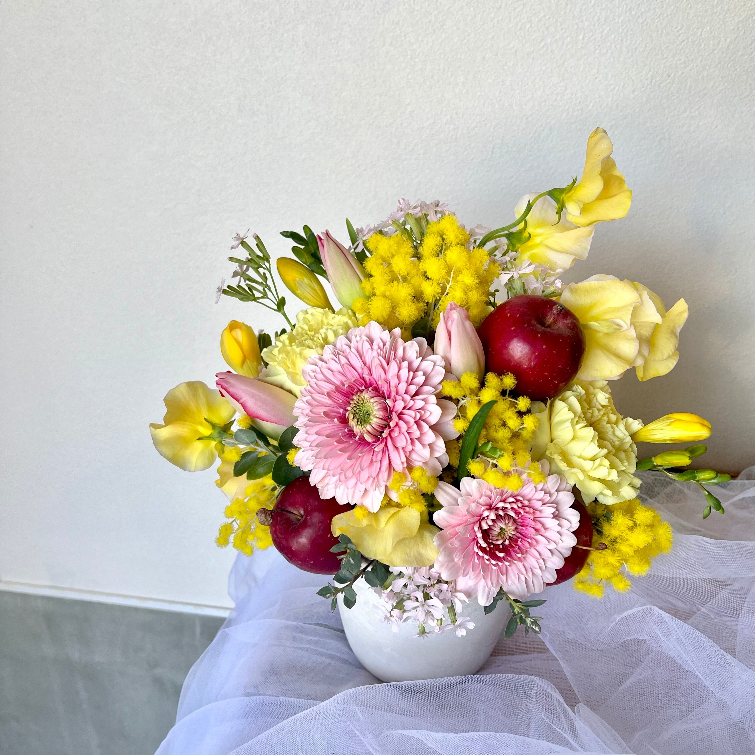 仕入れ状況によりブーケ・アレンジメントに入るお花は異なります。写真はボリューム感の参考例としてご覧ください。